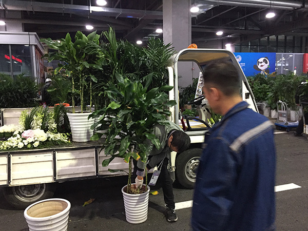 根据进口博览会的计划安排,10月26日至10月31日为各大展区的展台搭建阶段。在西入口通往中央圆形广场的人行通道内,摆满了绿色盆栽植物,一位花艺师正在通道旁的长条桌上制作插花作品,而旁边的车上已摆满了盆花和植物。一位女士表示,他们是进口博览会的指定花卉供应商,随着这两天展台搭建工作进入尾声,前来选购花卉和植物的参展商络绎不绝。