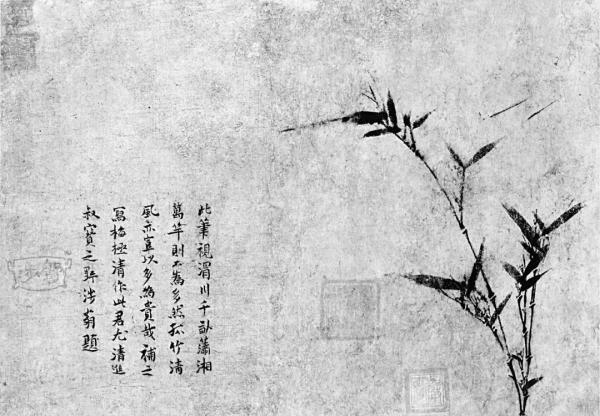 《宣和画谱·墨竹叙论》云:绘事之求形似,舍丹青朱黄铅粉则失之,是岂知画之贵乎?有笔不在夫丹青朱黄铅粉之工也。故有以淡墨挥扫,整整斜斜,不专于形似而独得于象外者,往往不出于画史而多出于词人墨卿之所作,盖胸中所得固已吞云梦之八九,而文章翰墨形容所不逮,故一寄于毫楮,则拂云而髙寒,傲雪而玉立,与夫招月吟风之状,虽执热使人亟挟纩也。至于布景致思,不盈咫尺,而万里可论,则又岂俗工所能到哉?画墨竹与夫小景,自五代至本朝才得十二人,而五代独得李颇,本朝魏端献王頵,士人文同辈,故知不以着色而专求形似者,世罕其人。