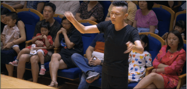 突然,李博用手语,比划了一段,随即拿着指挥棒,身体一压一弹,双手挥动。