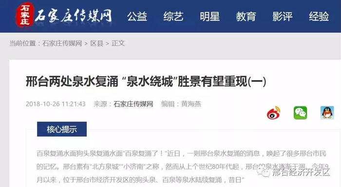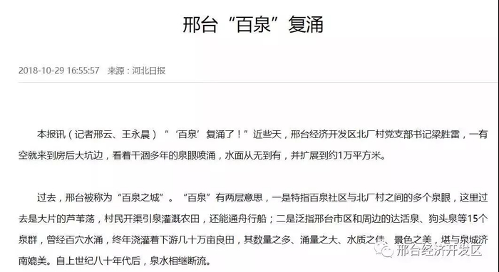 邢台经济开发区百泉、狗头泉复涌,让知道这个消息的邢台人感觉十分振奋!各大媒体也纷纷予以采访、报道,除了上边的《燕赵都市报》,《河北日报》、人民网、《牛城晚报》、河北新闻网等知名媒体也对这件事进行了报道。《河北日报》更是在头版予以报道。