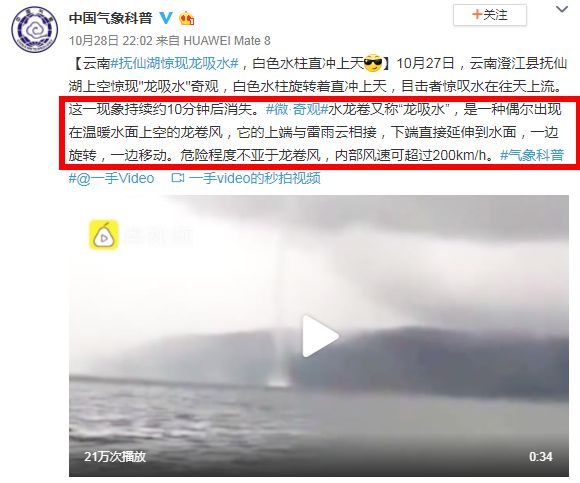 原标题:抚仙湖惊现"龙吸水" 水柱冲天!网友:一直都有传说……