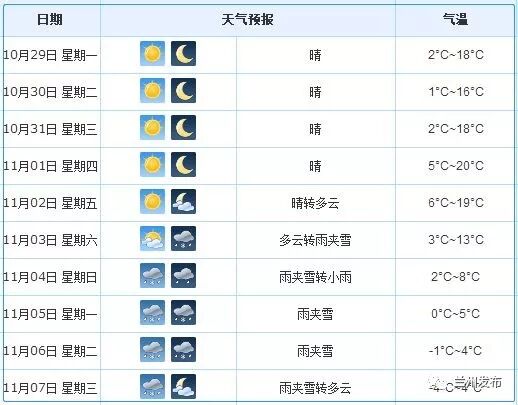 11月2日-4日,河西五市多云转阴,有5-6级西北风,部分地方有小雪;省内其余各地多云转阴有小雨(雪)。受冷空气影响,全省气温大幅下降。