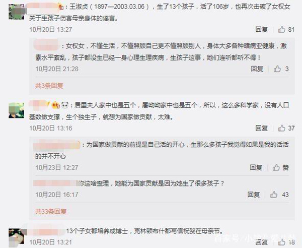 此时,煮肘发出的“女性不是工作机器,女性最伟大的是母亲” “女人最重要的职责是生育养育后代……一个孩子价值百万,10个价值千万。随便一个女人都本可以创造千万价值,现在大部分(职业女性)却愚昧地追求低价值的金钱,平均一人一生不足4万*40年=160万,极大地导致了贬值。”等发言和《娘道》等作品宣扬的母性至上论对她们而言无疑是有力的精神嘉奖。虽然对母亲的礼赞常常建立在匪夷所思的情况下,仿佛一个女人不会追求自我,只会追求牺牲;但对于没有事业成就、把大部分时间都投入家庭事务和育儿的女性来说,既然已经付出和牺牲,就需要承认和勋章。并且,一旦女性选择完全投入家庭并生养孩子,往往由于家务繁多,经济受控,工作机会变少,不易重新适应社会等原因而难以抽离,因而偏向于改变自己,顺应丈夫管制,避免婚姻中的冲突和婚姻失败后无依无靠的处境。近年来兴起的女德班,便是牢牢把握这种心理,教育女性如何规训自己,成为更得到丈夫认可的“好女人”,在家庭中获得幸福生活。