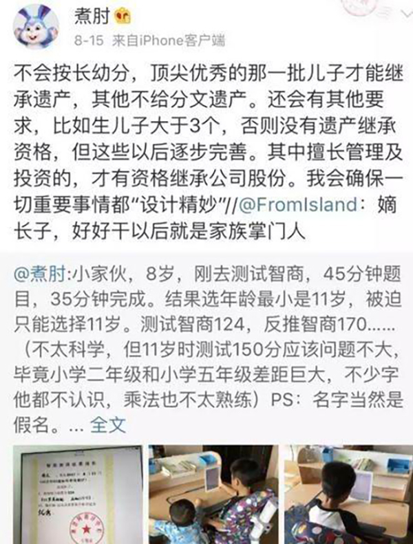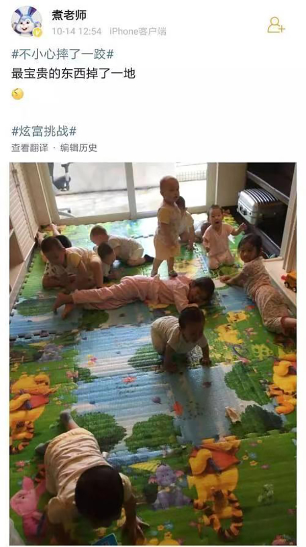 在前不久网络上兴起的“炫富挑战”中,有一位“情感博主”凭借一张12个孩子的照片成功爆红。该博主曾用微博id“煮肘”和“煮老师”,现更名为“宝宝老师”,并开设小号“生娃英雄”(以下都以其最有名的id煮肘称呼),称12个孩子都是自己的,并长期在置顶微博以年龄、三围、外貌等标准招收美女为他生孩子。综观他的言论,大多内容都是对一夫多妻的伴侣形式和繁殖进行礼赞,或者贬低知识与职业女性,号召女性尽快回归家庭。