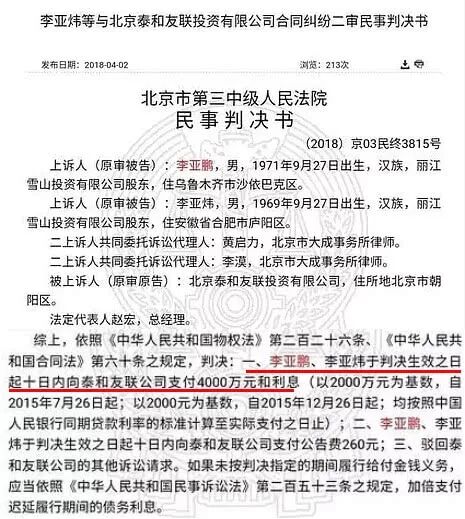 关于判决书中所示的丽江雪山投资有限公司,据天眼查数据显示,李亚鹏是该企业董事长,显示企业于2016年有一次变更信息,李亚鹏出资7000余万人民币变更了股权,持股比例27.84%。