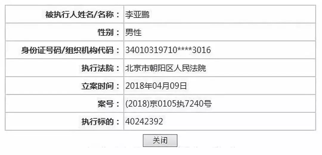 中国执行信息公开网的“被执行人信息”显示,李亚鹏,身份证号码出生日期为“1971年”(和李亚鹏公开的出生日期吻合),显示立案时间是2018年4月9日,执行法院为朝阳法院,案号为(2018)京0105执7240号。