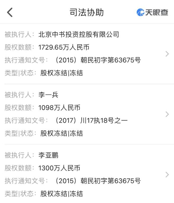 此外,天眼查数据还显示,丽江雪山投资有限公司共有三起司法协助案件,分别为冻结李亚鹏1300万人民币、冻结李一兵1098万人民币、冻结控股股东“北京中书投资控股有限公司”1729.65万人民币。