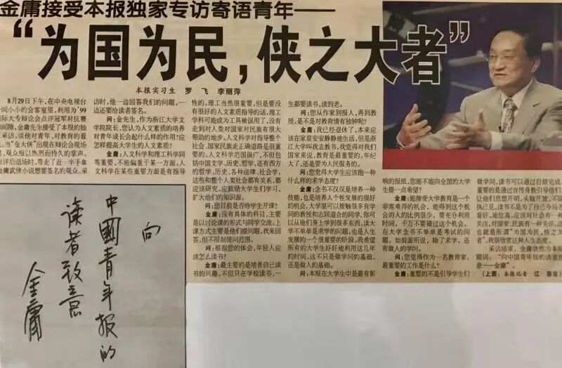 1999年金庸接受《中国青年报》独家专访时寄语青年:
