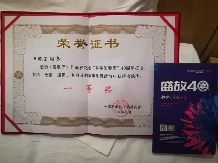 10月26日下午,中国科学院在京隆重举办“盛放40年”科学演讲活动暨纪念“科学的春天”40年获奖作品颁奖仪式。在颁奖仪式上,中国科学院工会对纪念“科学的春天”40周年征文、书法、绘画、摄影、老照片的故事等作品的获奖代表进行了表彰。我校王晓荣老师作为书法一等奖获得者受邀参加颁奖仪式。