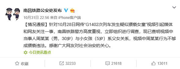 10月31日22点56分,南昌铁路公安处发布微博称,针对10月28日网传“G1402次列车发生疑似猥亵女童”视频引起媒体和网友关注一事,南昌铁路警方高度重视,立即组织进行调查,现已查明视频中当事人周某某(男,30岁)与小女孩(5岁)系父女关系,视频中周某某行为不够成猥亵违法。感谢广大网友对社会治安的关心。