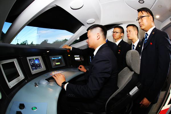 10月31日,在汉口动车运用所的一列动车组驾驶室,技术人员正为襄阳机务段普速列车司机进行实操讲解。