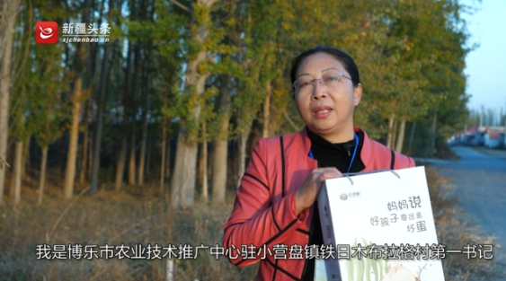 “大家好,我是博乐市农业技术推广中心驻小营盘镇铁日木布拉格村第一书记、工作队长韩咏香,我为我们村的‘迈德顺’土鸡和土鸡蛋代言。”