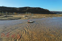 乘船的渡口便是三交镇的古渡口,此处黄河水甚为湍急。刘步飞说,今年黄河水量整整持续了100天高水位,为近年来所罕见。受此影响,汽艇每天下午3点就停止售票了,最近几日才有所调整。河岸上一路堆着半米多厚的泥沙,都是黄河漫上堤岸后留下的。前一阵子的黄河水位跟采访团到来时相比,至少要高出近两米。