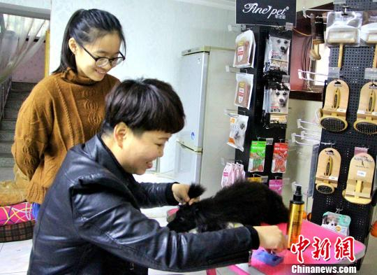 该店“共享宠物狗”的收费以周起算,领养时间在一周以内,每天收费30元人民币;超过一周,日收费随时间的延长相应降低。图为宠物店老板培训新人为宠物狗扎小辫。 赵晓 摄