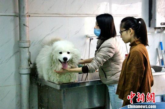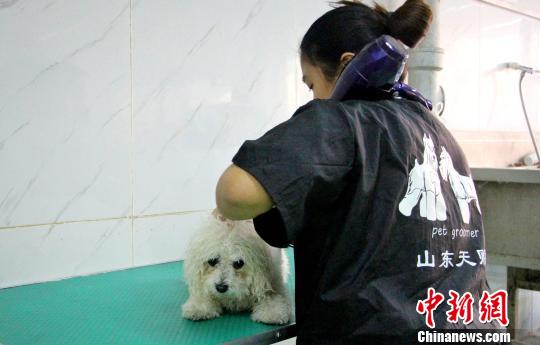 图为宠物狗洗完澡后,宠物店的工作人员帮它吹干湿漉漉的毛。 赵晓 摄
