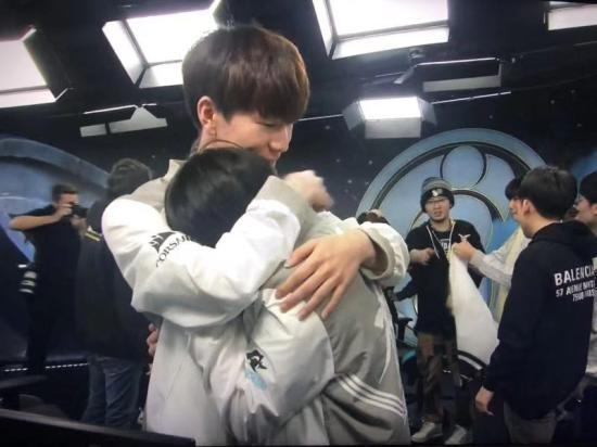 夺冠后,上单选手The Shy与中单选手Rookie相拥而泣。 英雄联盟官方供图