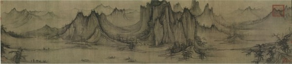 第一层远端。双峰措次屏立,雄峻险拔,积雪霭霭、丘壑幽深,有“崭绝峥嵘之势” ,明显北地景致,并俨然有北宋早起期山水壮穆雄厚气度。