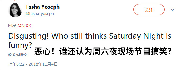 他在推特中写道:“‘周六夜现场’的喜剧演员戴维森嘲讽共和党人克伦肖戴眼罩,这一行为非常可耻。作为海豹突击队的一员,他在战斗中失去了一只眼睛。美国全国广播公司开人的标准是什么?侮辱受伤老兵是政治正确吗?!?(戴维森也侮辱了我,谁在意呢?!)”