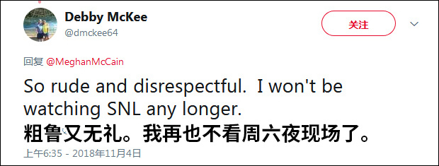 已故战争英雄约翰•麦凯恩(John McCain)的女儿梅根•麦凯恩称,戴维森的嘲讽对老兵、老兵家人以及现役军人来说,都是令人难以置信的冒犯。“周六夜现场”应该做的更好。