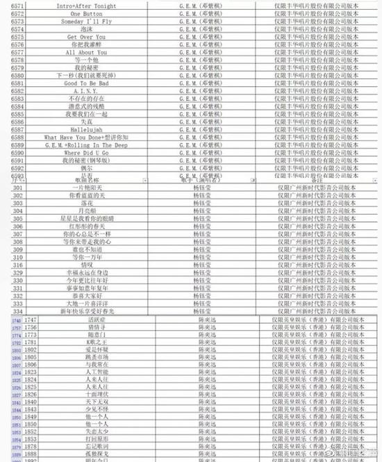 附件中共列出6609部要求下架的音乐电视作品。中国之声记者发现,陈奕迅的《十年》《圣诞结》、信乐团的《死了都要爱》等大家耳熟能详、几乎是KTV必点曲目,也都在“下架”之列。