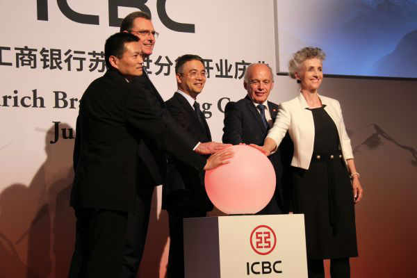 6月21日,中国工商银行行长谷澍(左三)、瑞士联邦副主席兼财政部长于利·毛雷尔(左四)、瑞士国家银行(央行)行长托马斯·约尔丹(左二)等共同庆祝工行苏黎世分行开业。(新华社)