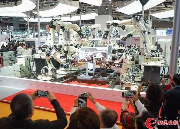 图说:日本不二越株式会社展出的机器人引来观众驻足拍摄 新民晚报记者 陈梦泽摄