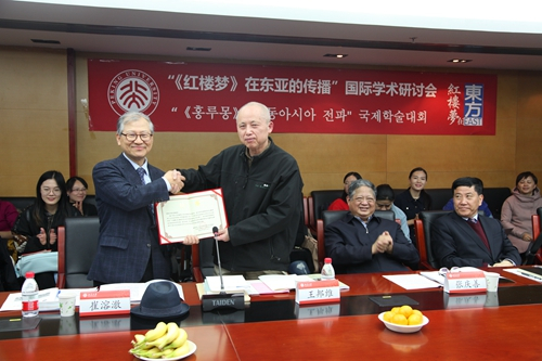 王邦维向崔溶澈颁发“《红楼梦》在东亚的传播”课题负责人聘书张庆善指出,《红楼梦》在东亚的传播是个很好的研究课题。文本如何传播到海外、海外又是如何接受文本,这些都是现今值得研究的地方。文化共同性是对人类共同生活的认知,《红楼梦》不仅是中国的经典文学,更是世界意义上的文学经典。此次研讨会聚集了中韩两国的专家学者,可见《红楼梦》是沟通中外文化交流的桥梁,他希望会议能更好地促进学术交流、增强双方友谊。
