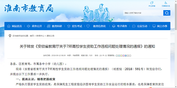 另外,针对国家励志奖学金评审违规问题,安徽省教育厅对淮北师范大学文学院进行了点名通报。