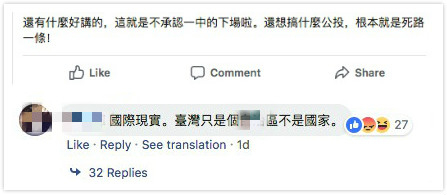 不少网友留言称,这就是不承认“一中原则”的下场!他们喊话那些鼓噪“公投”的人:“这是死路一条。”还有岛内网友提醒道:一个中国早已是国际共识。
