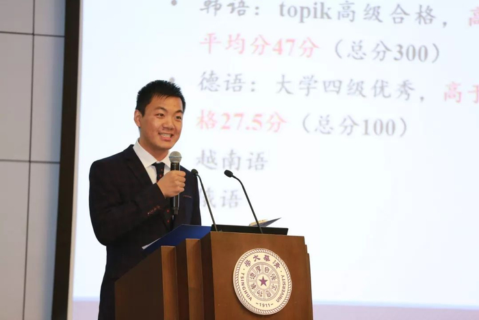 答辩现场,吕一铮用英语、日语、韩语、德语、越南语5种外语随机翻译“这对我并不困难”。他热爱语言和传统文化,有六门外语学习经历,其中4门外语获得能力证书,《大学语文》更是获得了近三年唯一的满分成绩。丰富的语言背景下,他主导了“基于iOS系统的汉字音查询应用及字音漂变研究”项目,并获得清华挑战杯一等奖。