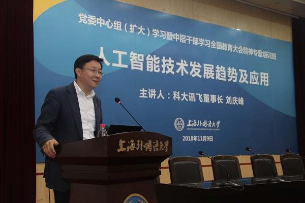 图说:科大讯飞董事长刘庆峰在上海外国语大学做报告 学校供图