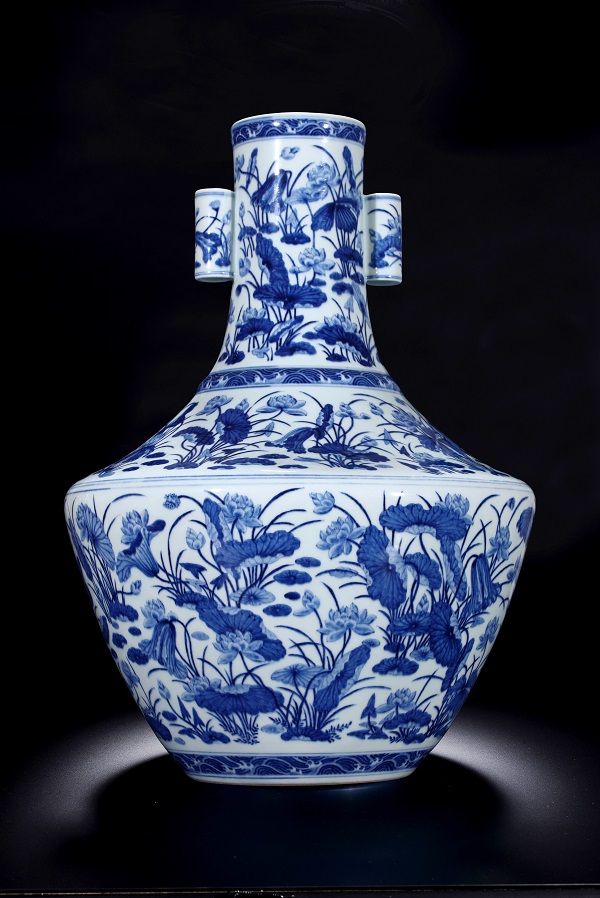 “清乾隆青花莲池清趣图折肩贯耳壶”,此件体量硕大,直口,长颈,颈两侧对称饰贴竖直管状耳,折肩,肩下渐收,圈足,造型稳重古朴。口沿、颈下方、近底足处各绘带状海水纹一周。双耳之上各绘荷花一组。颈部、肩部、腹部满绘高低错落的荷花、荷叶,纹饰繁复有序,清新而不媚俗,雅致且尊贵。底施白釉,正中落“大清乾隆年制”六字三行篆书款。