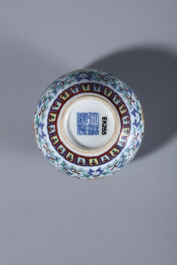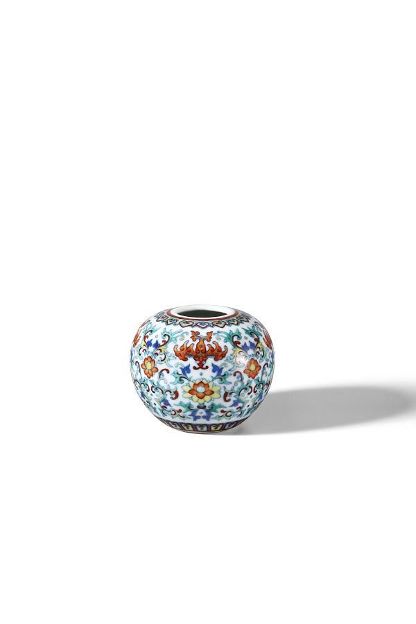 “清乾隆斗彩瑞莲福至心灵水盂”,水盂平口,丰肩,圆腹,束底。器体浑圆,通体施白釉,外壁斗彩绘缠枝莲纹搭配蝠纹为主题,先以青花绘整体纹饰,再于青花轮廓内填绘红、黄、绿、紫等色彩,艳丽华美。口沿及圈足处装饰精致的如意云头纹与变形莲瓣纹,肩部绘四只矾红蝙蝠被盛开的佛莲围绕,寓意“富贵吉祥”、“福至心灵”内壁及底施白釉,底青花书“大清乾隆年制”双行六字楷书款。此类特殊品种,即为御贡瓷器,由九江关监督在御窑厂精心烧造专门供乾隆皇帝御用的器皿,其数量少,质量精,纹饰和造型均不同于大运瓷器,一年三贡,分别于端阳节,万寿节和年节这三个节日前进宫供御。