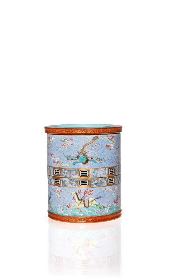 古人所用之物,皆附以美好寓意,清宫帝王之物更是言必有意,意必吉祥。另一件“清乾隆御制洋彩 ‘江山一统’八卦玲珑旋转笔筒”为直筒型,制作工艺精巧,口、足边出,环壁形足。内施松石绿釉。筒身以天蓝色地绘蓝彩卷草纹成锦地,筒身上壁可旋转,绘以洋彩五色凤、凰二禽,并遍布祥云纹。腹部中央为上下两周小长方形开光,饰“万字不到头”以喻万寿无疆,并于描金开光内以墨彩书八卦卦象。筒身下半部绘龙马负图、灵龟两只、及六岳山石及海浪灵芝。外口、足边饰红彩描金纹饰。底施松石绿釉,落青花篆书“大清乾隆年制”款。此件笔筒转心之处饰以太极八卦纹样,上下交泰以示天地,旋转器身,将之组合为上干下干六个阳爻的干卦,是为笔筒首要主题图案。据悉,因成品率极低,存世稀少,为公私收藏存世仅见的两件江河一统笔筒之一。