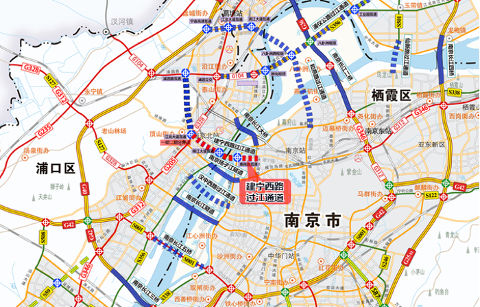 上个月底,该项目一期初步设计新近通过专家评审。作为南京骨架路网的重要组成部分,建宁西路过江通道距上游扬子江隧道约1.8公里,距下游长江大桥约2.4公里,是江南主城对接江北核心区的重要通道,也是缓解城市内部过江通道交通压力的重要分流压力的重要分流通道。建宁西路过江通道工程(一期)起于江北新区的兴浦路与江北快速大道交叉处,向南顺兴浦路穿越长江至江南岸,沿现状建宁西路布设,穿越江边路、惠民路后,止于建宁西路与热河路交叉处,接入城市路网。主线江北段采用城市快速路标准建设,设计速度为80公里/小时,江中及江南段采用城市主干道标准建设,设计速度为60公里/小时。项目总投资估算约118.9亿元,建设工期约5年。