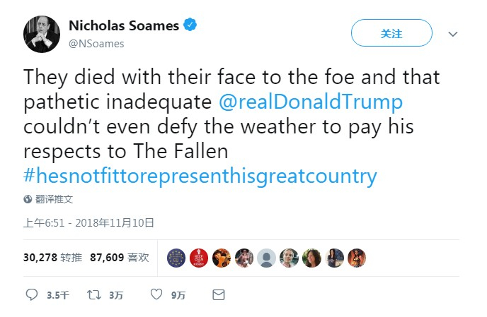 “他们面对敌人英勇地死去,而可悲的、不称其位的特朗普却因为天气差就不去向逝去的战士表达敬意。”索姆斯在推文最后还加上了 “他不配代表他的伟大国家”的标签。