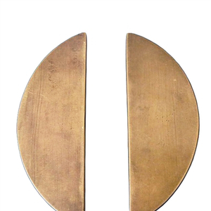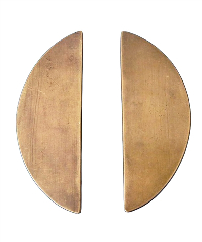 这对民国时期的鸳鸯板,小巧精致,其长度为14厘米,每只宽度4.3厘米,厚0.25厘米,质地为黄铜。该板形状为月牙形,用料厚实,表面光滑,边缘圆润细致。由于长期使用之故,除手握处仍然保留黄铜本色,其余地方表面略显氧化,形成自然的包浆。持之在手,相互轻敲,“叮当”之声清脆悦耳。倘若双目微闭,单手击板,顿时有“铁马冰河入梦来”的意境。