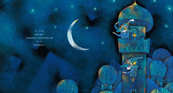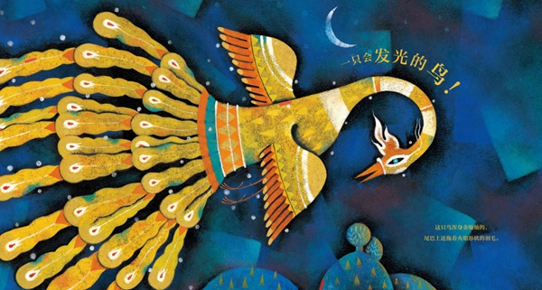 绘者哈桑说,最早拿到这个故事时,首先联想到了伊朗传统故事里也有这样类似的神鸟,所以虽然是跨国、跨文化的合作,但是能够让自己的感受与文字作者相通。在颜色设计方面,他也是希望与这种想象中的意境相吻合,尤其是给读者一种在非常暗的光线下突出这个鸟是一只神奇的、发光的鸟的感觉,所以书中很多页面的背景都以深蓝色为主,但这种深蓝色是有层次感的,晚上的星空不是单纯的黑色,是有丰富层次的。而谈到跨国合作的磨合问题,哈桑认为,虽然伊朗和中国在生活习俗上有很大的差异,但两国的古老文化是有很多相通之处的,比如伊朗传统的细密画与中国的工笔画有很类似的地方,而本身这个故事的设定是一个古老的时代,所以在图文的契合方面并没有很大的困难。
