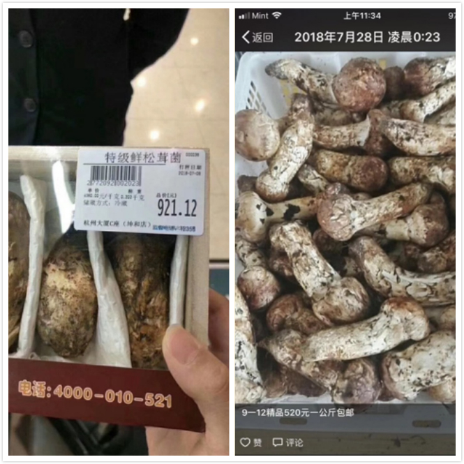 左:杭州某超市的松茸价格(4560RMB/Kg);右:香格里拉某客栈老板朋友圈的松茸价格(520RMB/Kg);松茸价格受到上市时间、开伞程度、大小、品相等复杂因素的影响,也极大地依赖于日本市场的情况,具有很强的不稳定性,刘树形容它像“股票”。