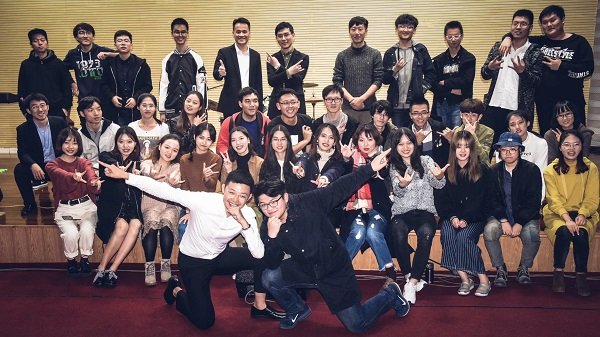 参与演出的红不了民谣社、吉他协会和中北音乐协会的全体师生合影,前排白衣者为民谣社指导老师孙梦。    摄影:常涵熙。