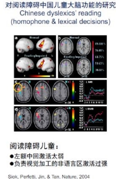 对阅读障碍的中国儿童的大量研究发现,左脑额中回激活太弱,但是这些区域对英文阅读障碍的儿童没有什么影响。