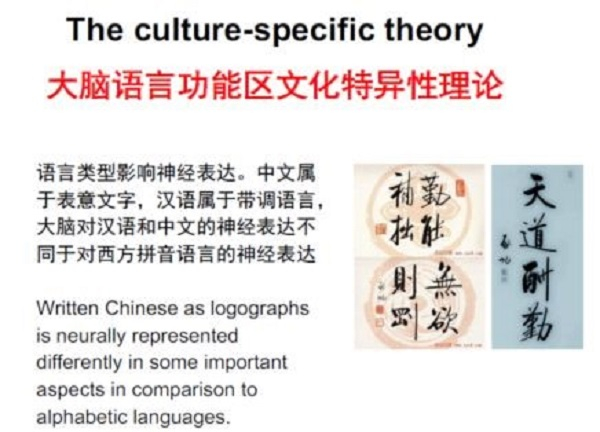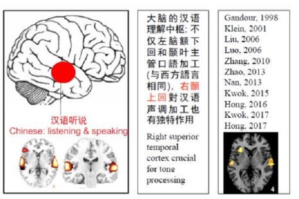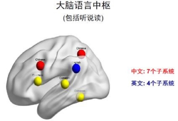 通过对语言能力异常人群的研究,我们发现左脑额中回涉及到两种不同的大脑神经网络和区域,中文阅读障碍和英文阅读障碍属于不同的脑部发育失调。大脑负责中文区域有7个系统,负责英文区域有4个系统。我们关于中文阅读中枢的发现,得到国内外十几个实验室所发表的实验结果的验证和支持。