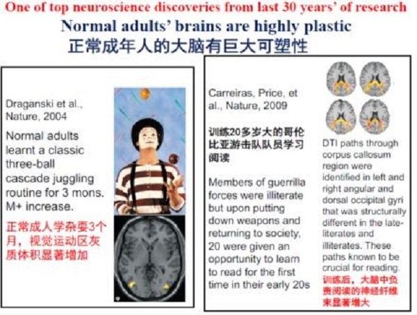 我们要明确一个认识,人的大脑在整个生命周期都具有高度可塑性,从而为智能开发、脑功能康复提供了生理基础。这是神经科学的重要发现。经过多年语言学习训练之后,我们发现,大脑学习不同语言,可以激活大脑不同区域。