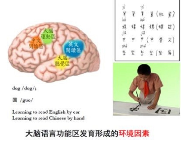过去十几年,学界对人脑加工中文的脑科学研究发现,中文的大脑神经表达与英文既具有共同点,又具有重要差异。临近大脑运动区的左脑额中回对中文加工尤其重要,而这一阅读中枢的形成与我国儿童的书写因素紧密相关,还与书写技能与中文阅读能力存在高度相关。