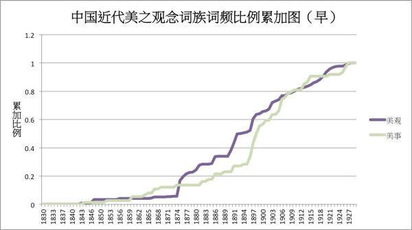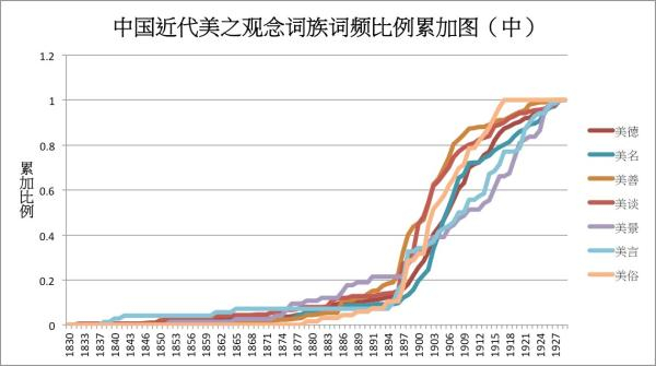 他在四大群组中,基于过去在中国近代思想史研究的学力积累与鉴别力,依照时间发展先后,各自寻找一个可以代表该群的核心概念作为观察对象,发现能解答他的研究问题的最重要的关键词分别是美善、美术以及美育,根据时间序列图来看,这其中,美善的使用是在1895年前后开始,美术稍晚,在1900年前后,而美育是1915年前后才涌现的。