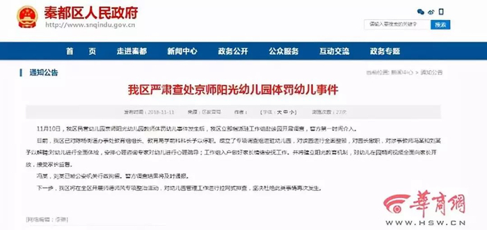 11月11日,咸阳市秦都区教育局通报称,事发后,秦都区立即指派驻工作组赴该园开展调查,警方第一时间介入。目前,冯某,刘某已被公安机关行政拘留。警方调查结果将及时通报。