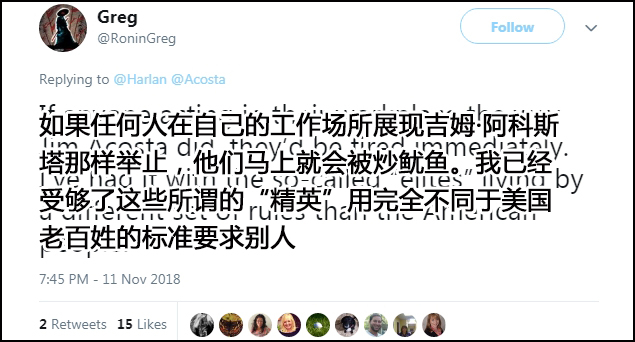 不过11月14日晚,福克斯主持人塔克·卡森(Tucker Carlson)却在节目中指出CNN的“双重标准”:“CNN只有在自己说话时才会捍卫言论自由”(CNN defends free speech only if it‘s their own speech)。