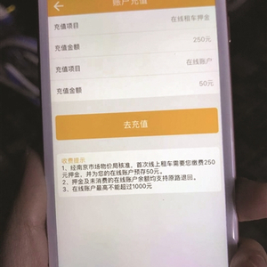 南京公共自行车APP里要充250元押金的页面。