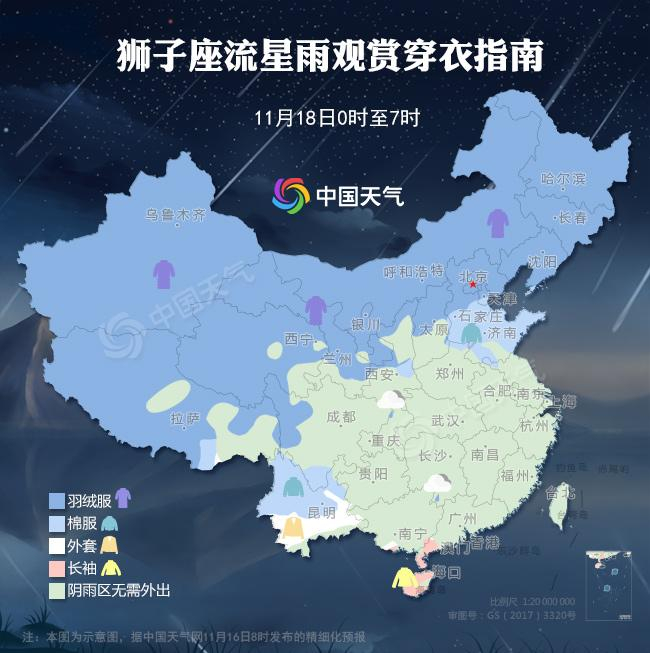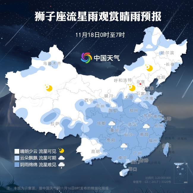观赏流星雨无需使用专业的天文望远镜,肉眼可见,月光也不会影响观赏效果,天气条件成为能否看到流星的决定性因素。据中国天气网精细化预报,18日0点到7点,我国天气为北晴南雨。北方除山西、陕西、河南等地天空云量较多,其余大部晴朗少云利于观赏。南方除云南外,大部地区非阴即雨,对着流星许愿的美好计划要“泡汤”。