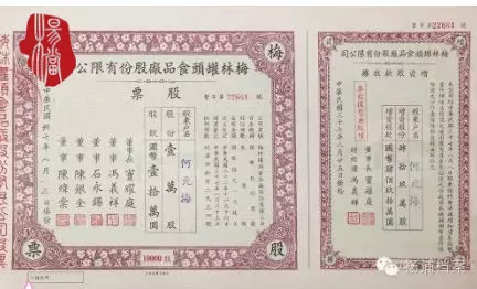 1948年梅林罐头食品厂股份有限公司股票上,印着股东何元海,董事长窦耀庭,董事冯义祥、石永锡等名字。